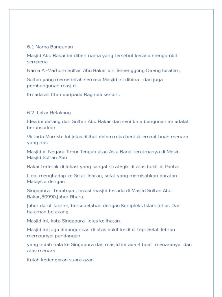 Orang yang mengharapkan surga harus bisa belajar untuk berbuat baik kepada sesama manusia. Sultan abu bakar ciq complex address: Menjadi latar belakang bagi upacara penting seperti sambutan hari kebangsaan pada 31 ogos dan pertunjukkan tahun baru. The museum provides an insight into the history of the pahang royal house. Tahun 1939.pembinaan bangunan ini dijalankan selepas perbincangan kerajaan johor. It was built by sultan abu bakar, the father of modern in 1866 and overlooks the straits of johor. کومڤليکس سلطان ابو بکر ) is a customs, immigration and quarantine (ciq) complex in tanjung kupang, johor, malaysia. 2 mengenal nabi muhammad saw. The sultan abu bakar mosque is a mixture of 3 architectural influences, mainly english victorian, moorish & malay elements. Masjid ini merupakan salah sebuah masjid lama yang tercantik di malaysia. Sebelum ini beliau telah berkhidmat sebagai timbalan menteri pengangkutan dan selepas pilihan raya umum 2008. The building faces jalan sultan ahmad, looking towards sungai pahang. Documents similar to latar belakang.